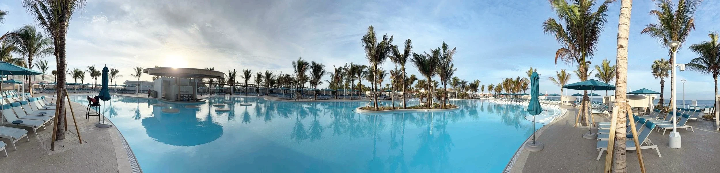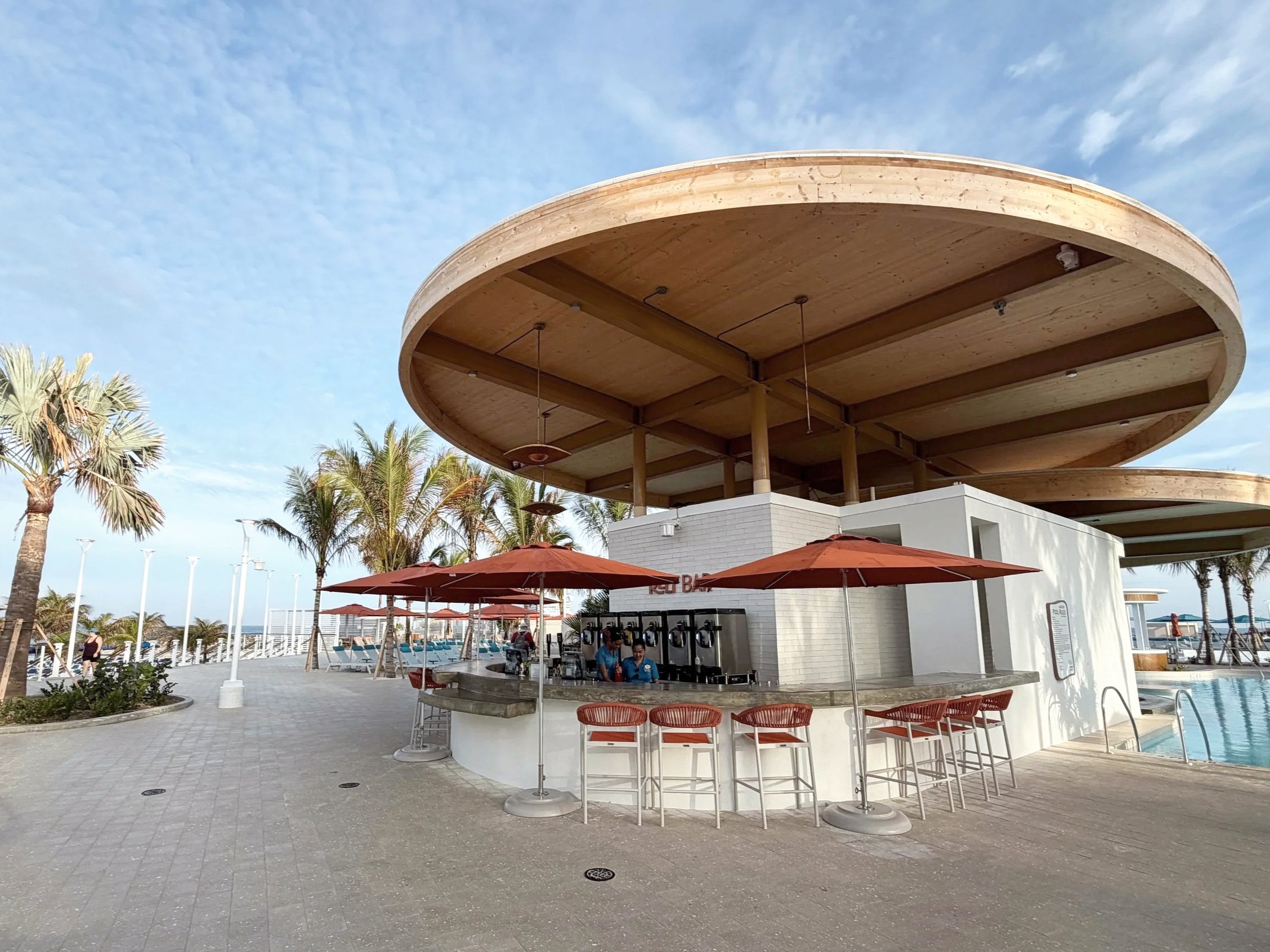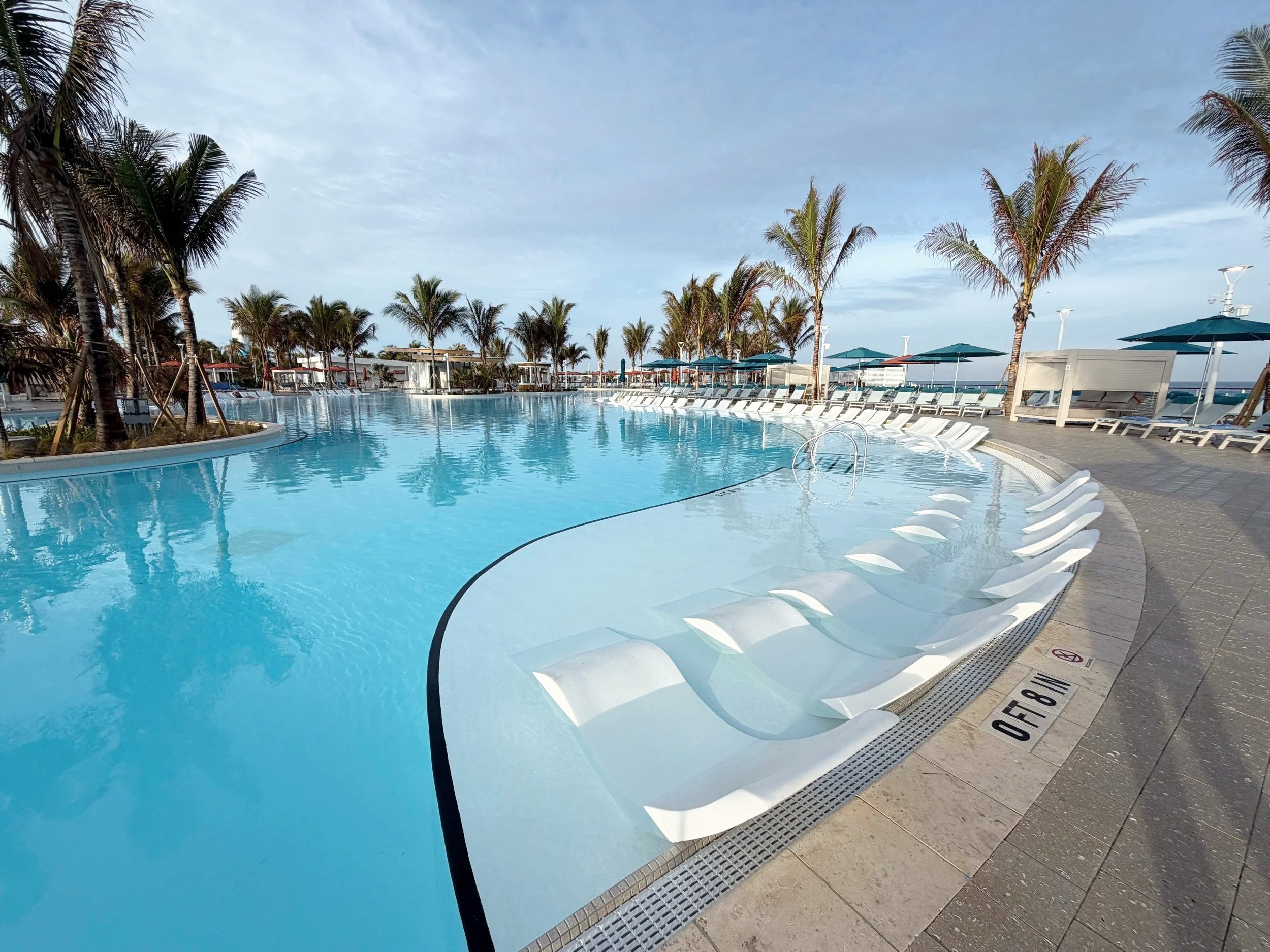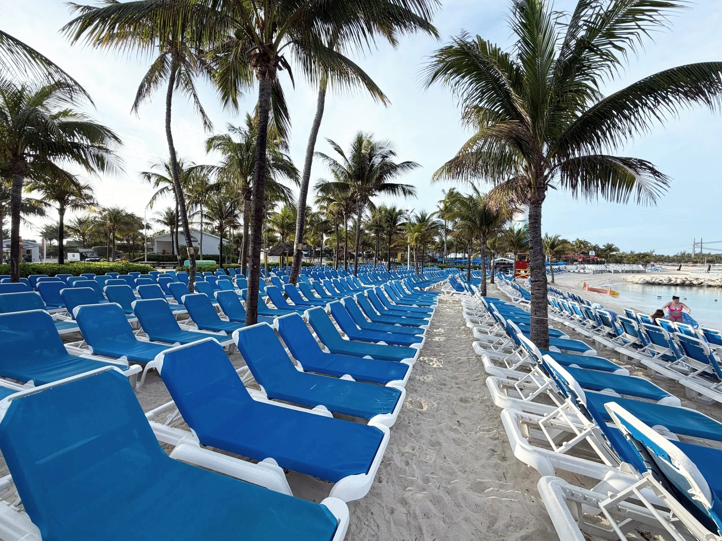 The pool spans approximately 28,000 square feet, making it one of the largest pools on any cruise private island. The surrounding deck features a large number of complimentary loungers available on a first come basis, along with shaded seating, restrooms, and outdoor showers.