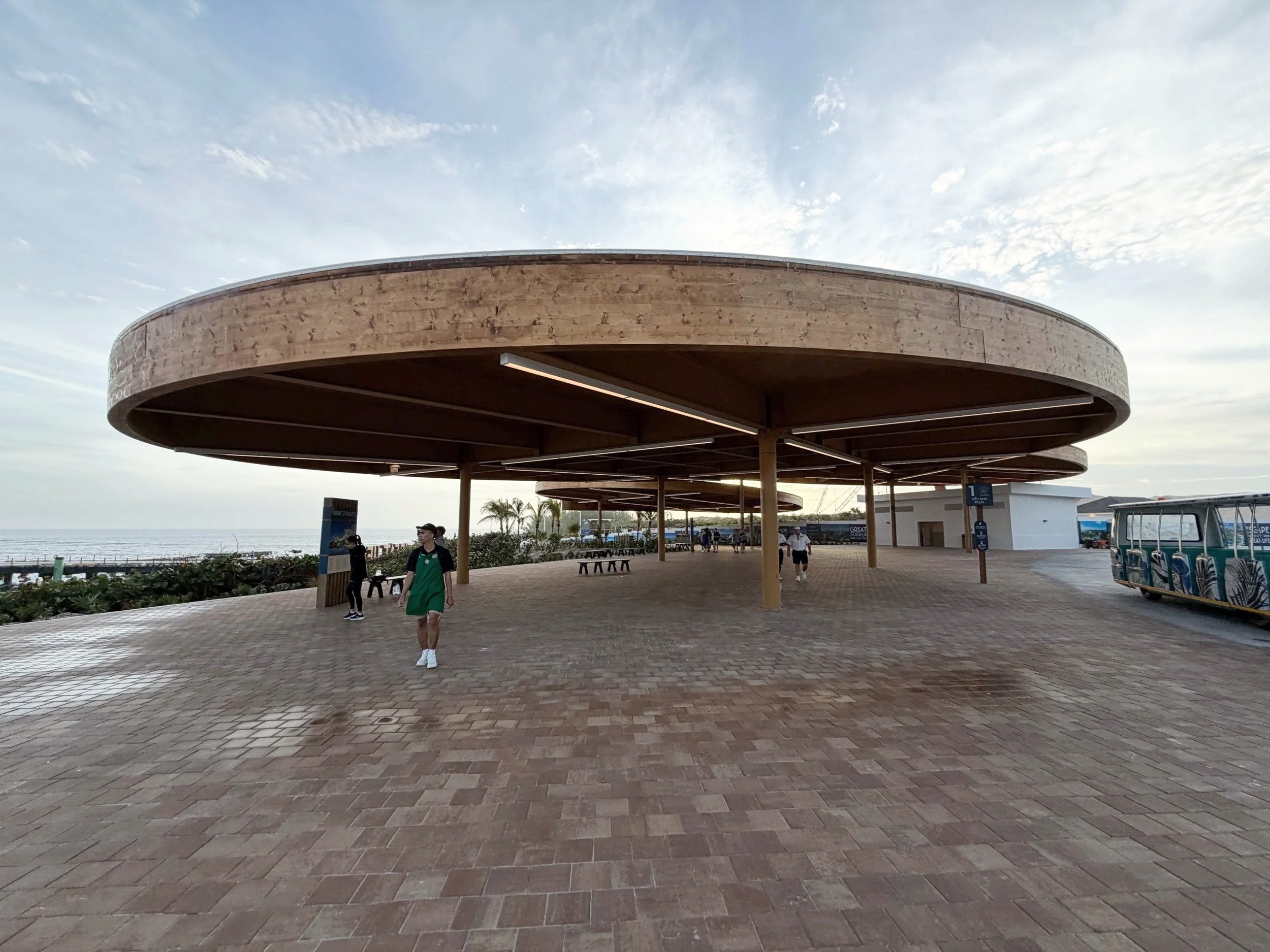 At the end of the pier is the Welcome Plaza, which serves as the main arrival hub. The plaza includes restrooms, seating areas, island maps, directional signage, and photo locations with views of docked ships. Guests can walk to nearby attractions or board the complimentary tram system from this area.
