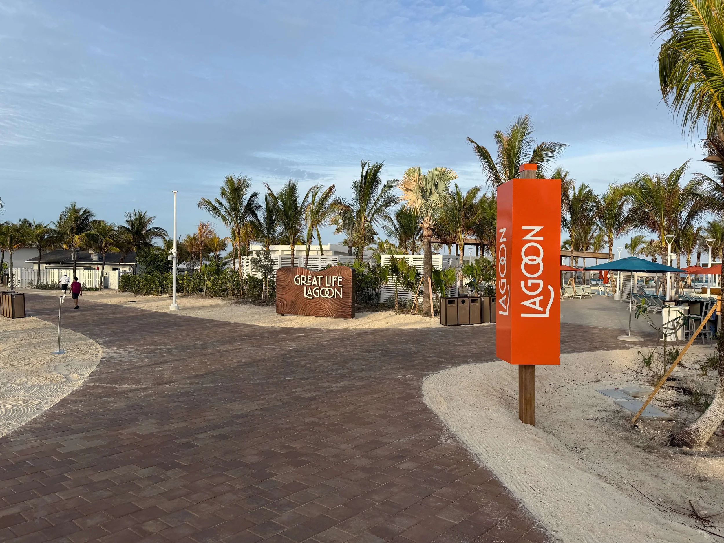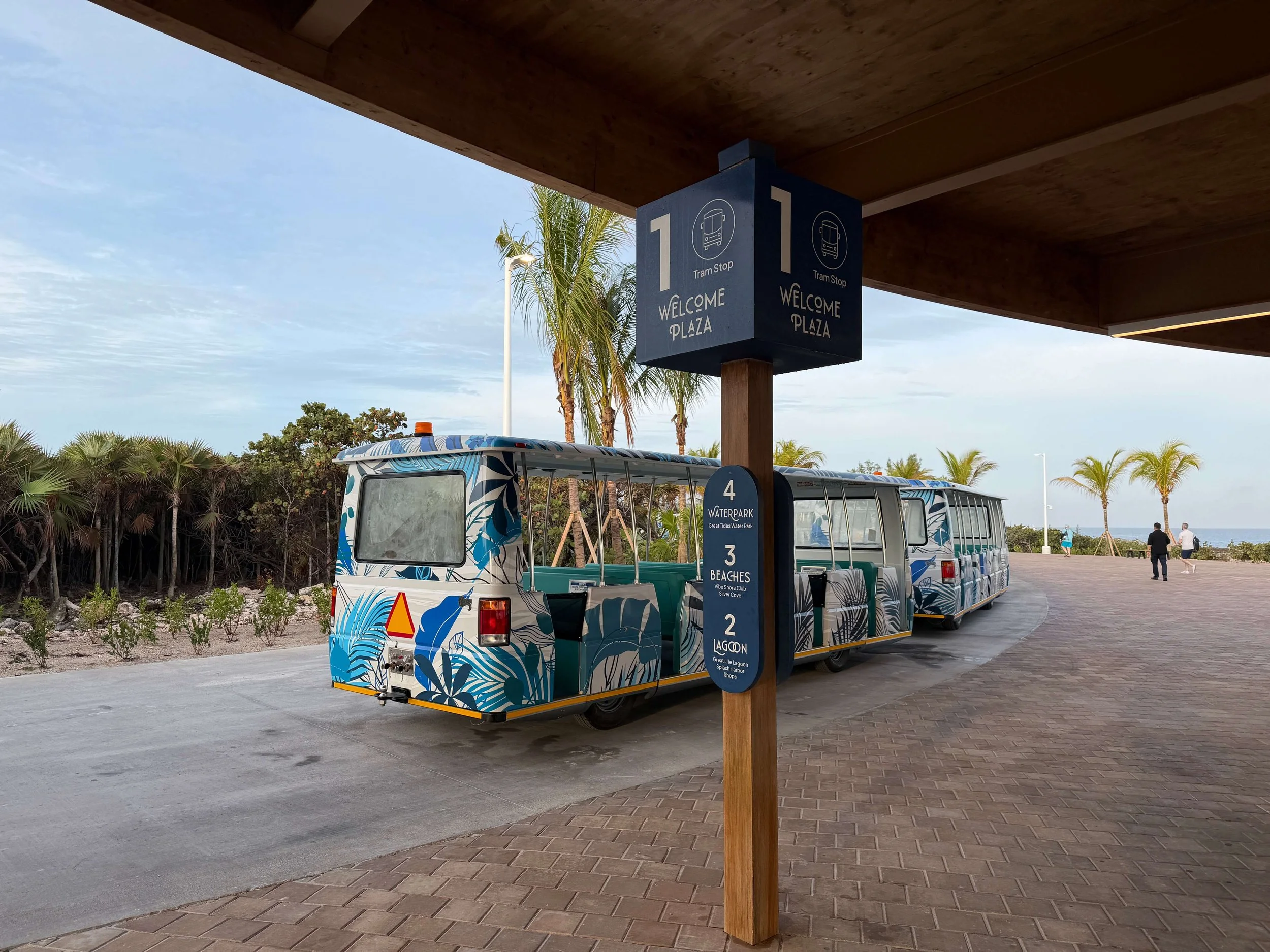 Great Stirrup Cay is easy to navigate. Complimentary trams operate continuously between major locations, including the Welcome Plaza, Great Life Lagoon pool area, beach zones, and premium areas such as Silver Cove and Vibe Shore Club. A future tram stop is planned for the Great Tides Waterpark once construction is complete.