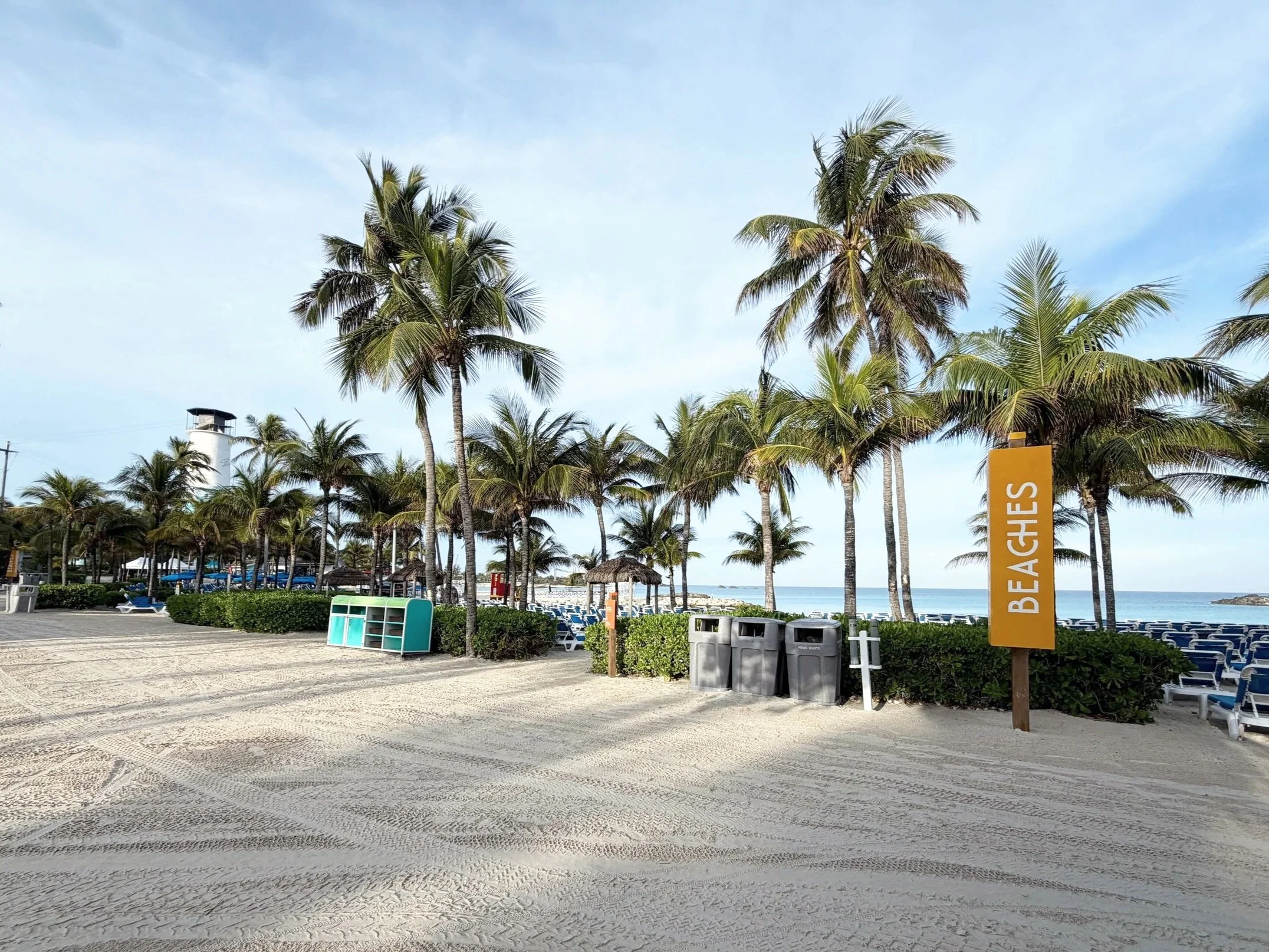 Guests should bring beach towels from the ship, as towels are not provided on the island. Beach environments range from active areas near bars and dining to quieter sections farther from the main attractions. Clamshell cabanas and traditional beach cabanas are available for rent in select areas and provide guaranteed shade.