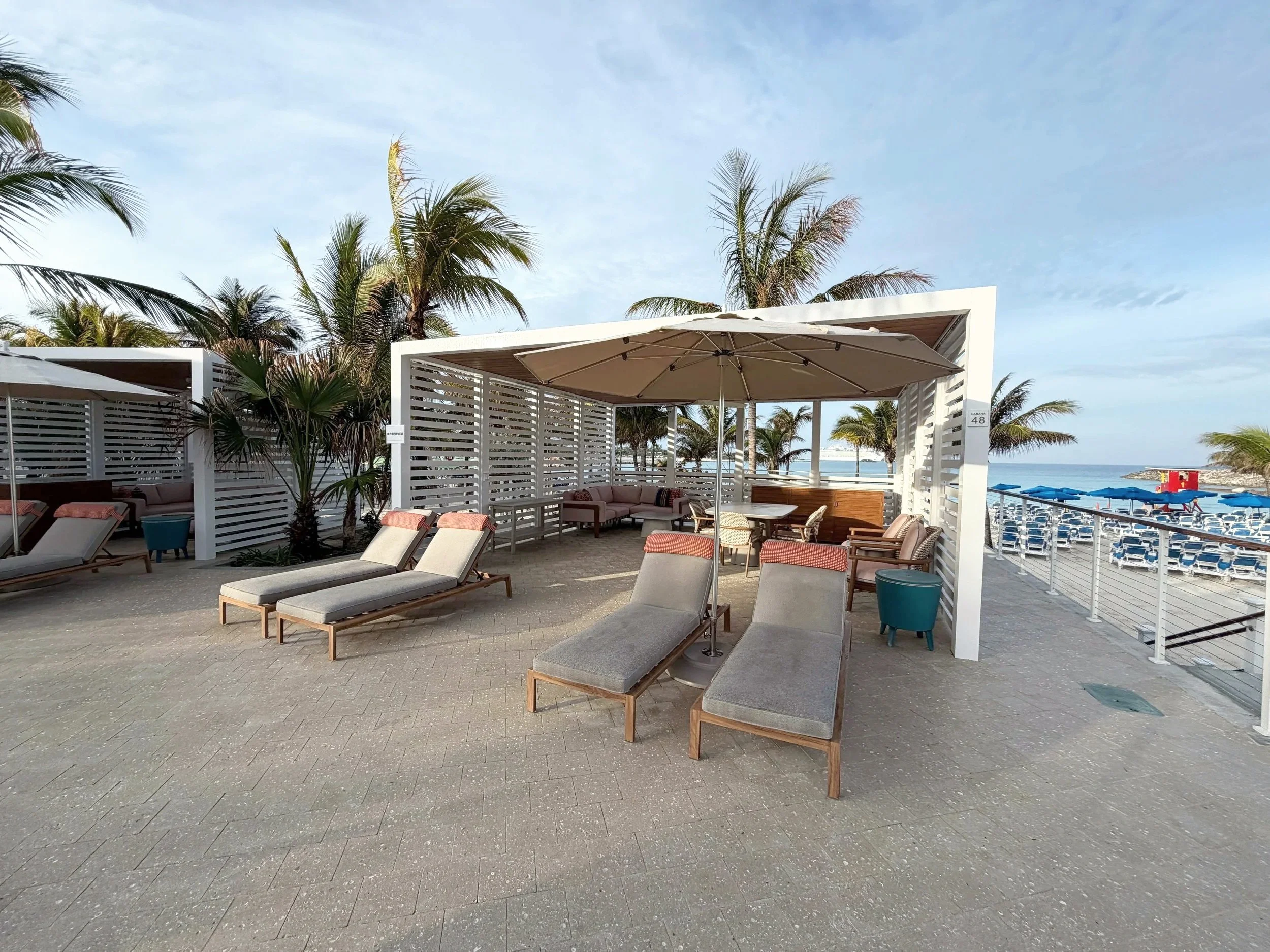 Most cabanas and villas include reserved seating, shade, and attendant service. Some locations offer food and drink delivery. Availability and pricing vary by sailing, and advance reservations are recommended.